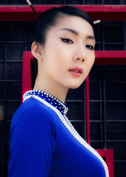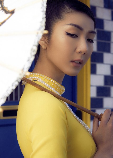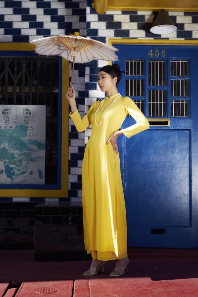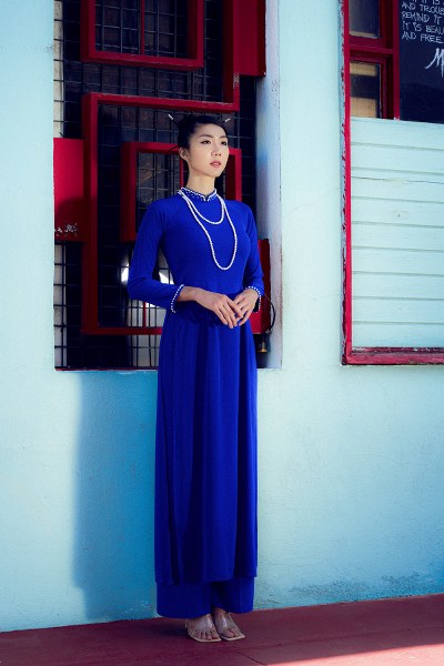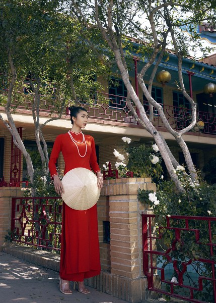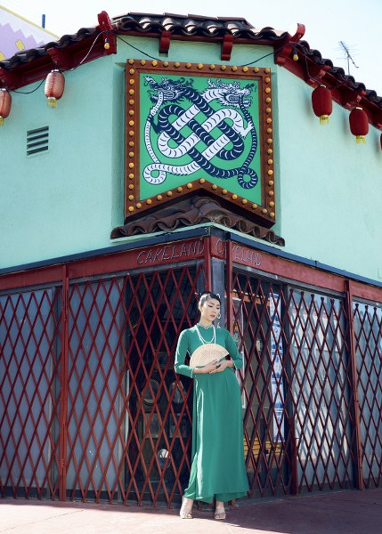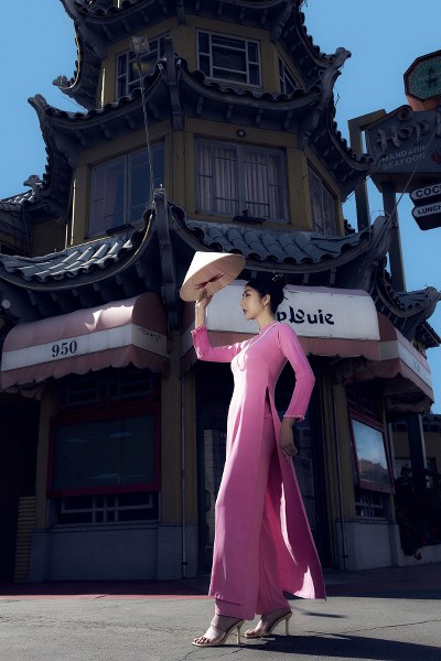 Người mẫu Ngọc Quyên chọn bối cảnh khu phố Chinatown ở Los Angeles để chụp hình bộ sưu tập \"Nét Á\" với những thiết kế áo dài đậm chất truyền thống.