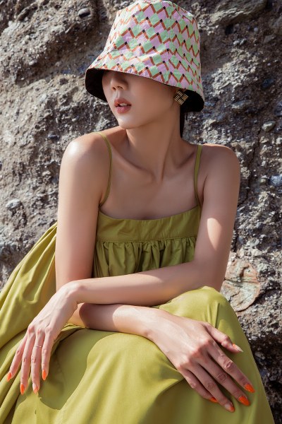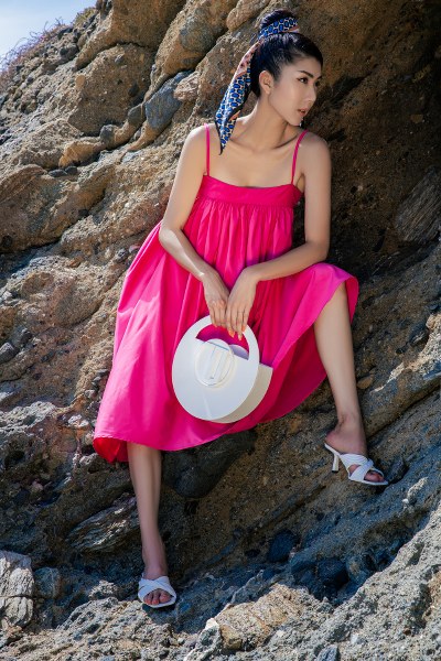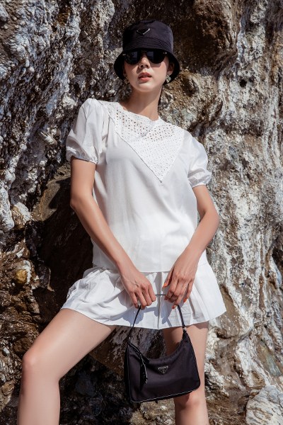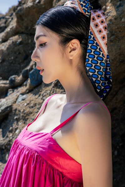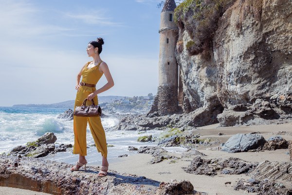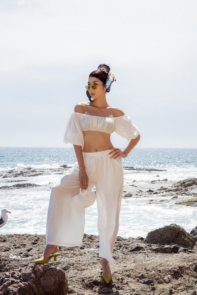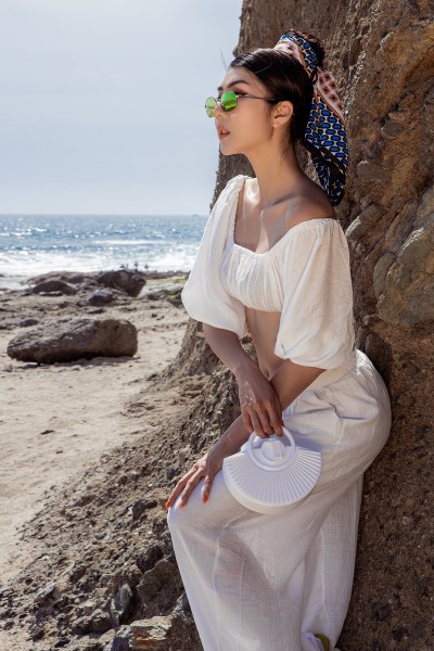 Khăn turban họa tiết, mũ cloche hay kính râm, túi xách là những phụ kiện yêu thích mà Ngọc Quyên chọn cho các chuyến đi biển.
