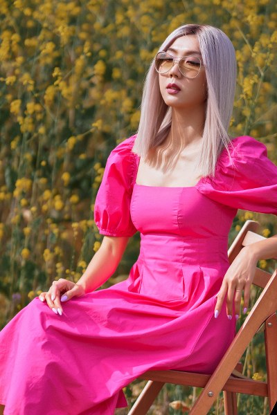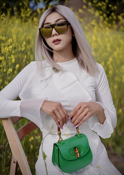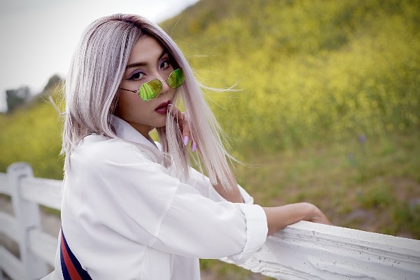 Ngọc Quyên thực hiện bộ ảnh với mái tóc bạch kim ở đồng hoa cải.