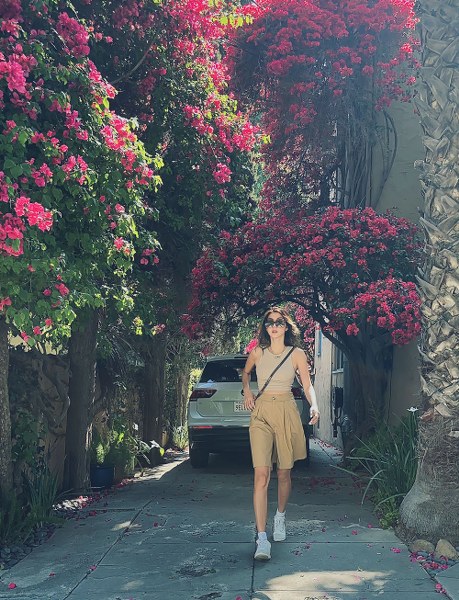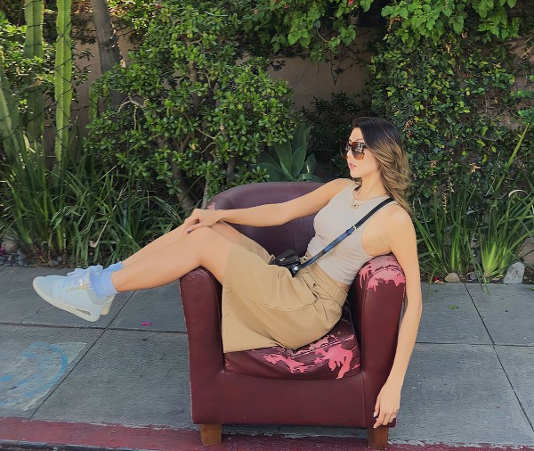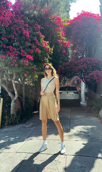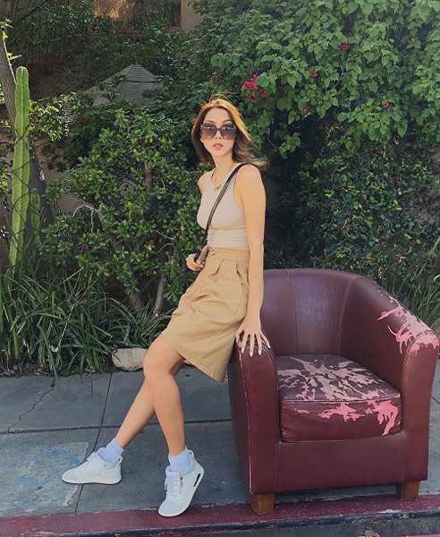 Người đẹp linh hoạt chọn thắt lưng bản nhỏ đi kèm, giúp tổng thể trở nên gọn gàng. Đôi giày thể thao “ton-sur-ton” với kính mắt cũng là điểm nhấn thú vị giúp hoàn thiện vẻ ngoài sành điệu, hợp thời.