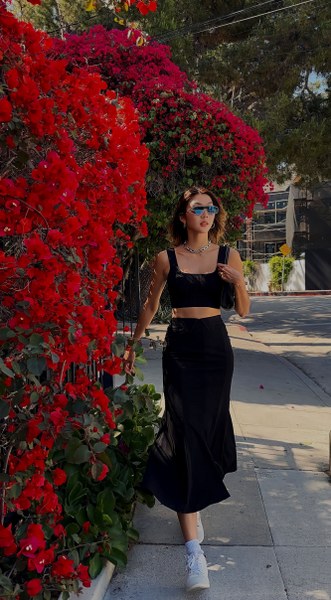 Khoác lên mình set đồ đen tuyền gồm áo crop-top và chân váy dáng đuôi cá, Ngọc Quyên tự tin sải bước trên phố, gợi nhớ tới hình ảnh lạnh lùng, quyền lực của người đẹp trên sàn catwalk năm nào.