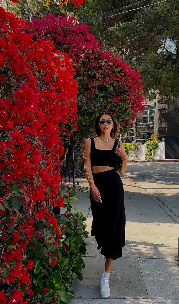 Thiết kế chân váy lật cạp đang mốt mix ăn ý cùng áo hở eo giúp cựu siêu mẫu khoe được vòng 2 săn chắc, vòng 1 đầy đặn và vòng 3 nở nang. Ngọc Quyên khéo léo mix thêm phụ kiện gồm giày sneaker trắng, kính râm, túi đeo vai và vòng cổ chunky.