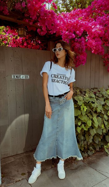 Chân váy denim dáng maxi là item hợp với xu hướng hiện hành nhưng không hề dễ mặc. Ngọc Quyên kết hợp với áo thun trắng in chữ theo phong cách tối giản.