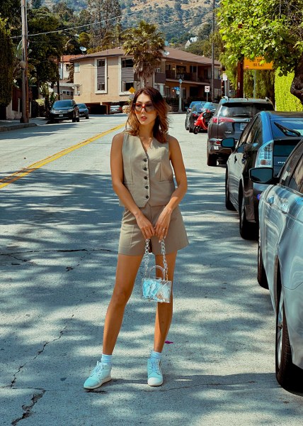 Set đồ vừa mang phong cách menswear vừa nữ tính được chân dài 8x “thuần phục” bằng chiếc túi xách dây xích trong suốt độc đáo. Set đồ hợp xu hướng giúp Ngọc Quyên khoe trọn cặp chân dài cùng làn da rám nắng khỏe khoắn.