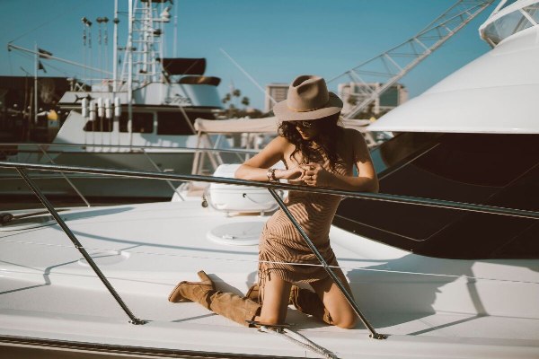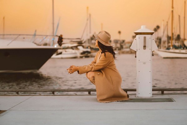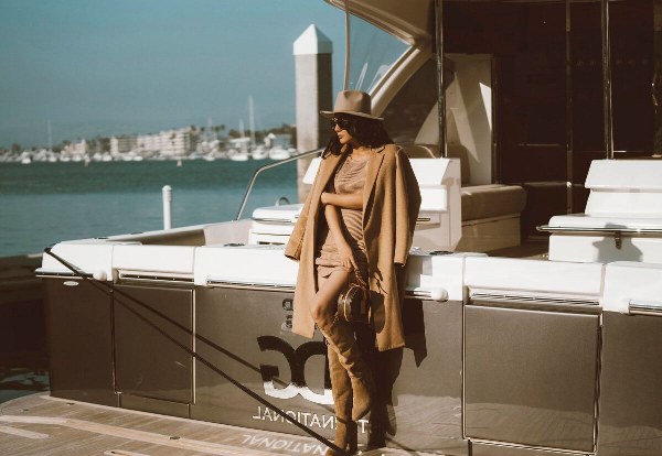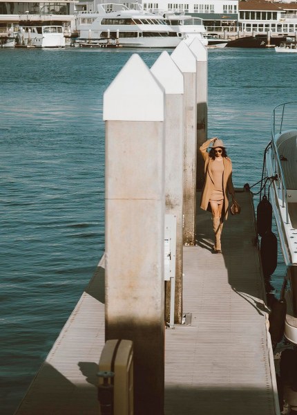 Ngọc Thúy diện trang phục ton-sur-ton nâu tạo dáng trên bến cảng.