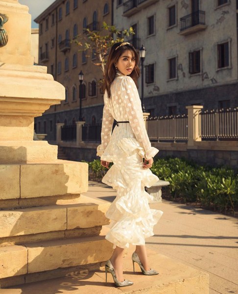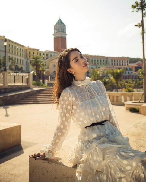 Đầm xếp tầng thiết kế trên chất liệu vải voan chấm bi lấy cảm hứng từ dòng thời trang classic giúp Ngọc Trinh trang nhã hơn.