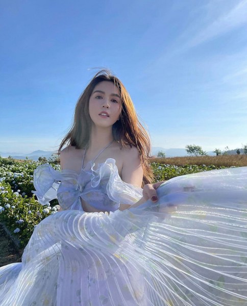 Đầm cổ điển kết hợp giữa áo siết eo và chân váy voan lụa mềm mang lại hình ảnh thư thái cho Ngọc Trinh khi đi nghỉ dưỡng.