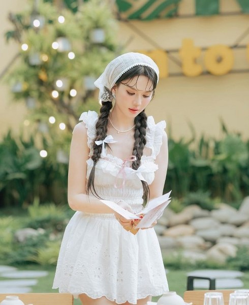 Tại một sự kiện đầu tháng 10, người đẹp diện váy cotton ngắn trên gối, tết tóc hai bên kèm mũ trùm đầu.