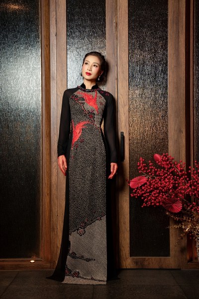 Nhà thiết kế sử dụng họa tiết chim hạc chủ đạo với kỹ thuật dệt, thêu và đính đá thủ công. Ngoài ra, anh còn tái hiện một số thắng cảnh của Việt Nam, Nhật Bản trên phần tà nhằm thể hiện tinh thần giao thoa văn hóa.