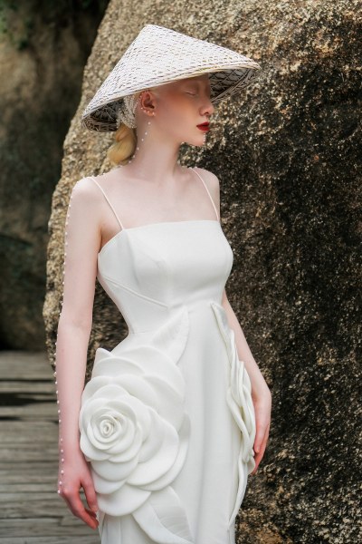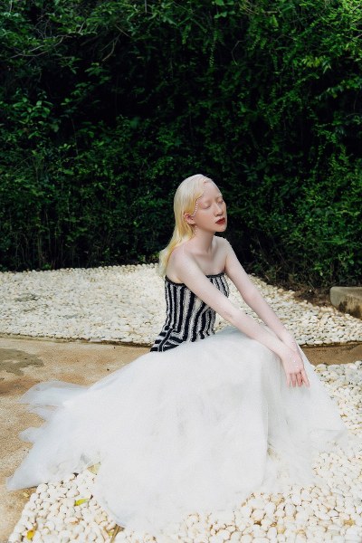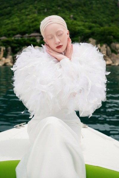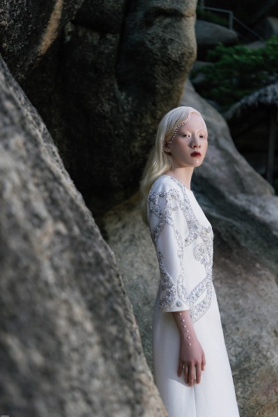 Người mẫu bạch tạng Quỳnh Ngô thể hiện các thiết kế trong bộ sưu tập "Sứ" của Hà Duy.