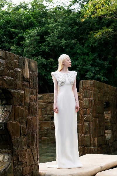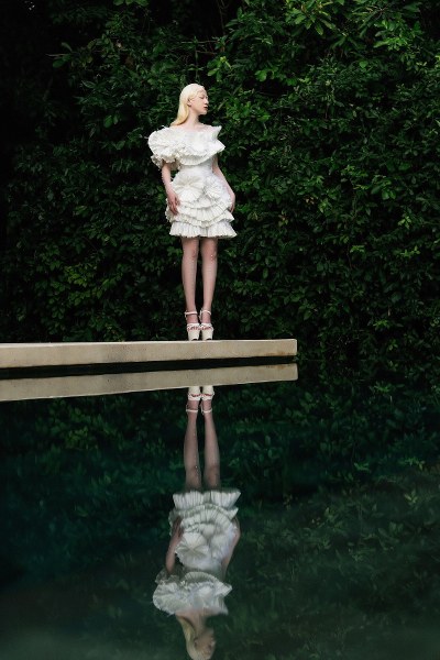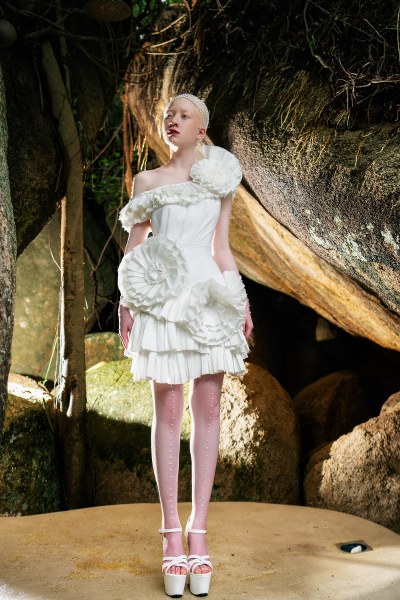 Các thiết kế đều sử dụng màu trắng, khai thác kỹ thuật xếp bèo, xếp tầng trên phom đầm cocktail, đầm dự tiệc high-low, suông.