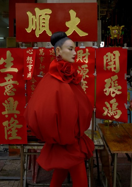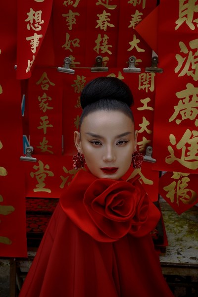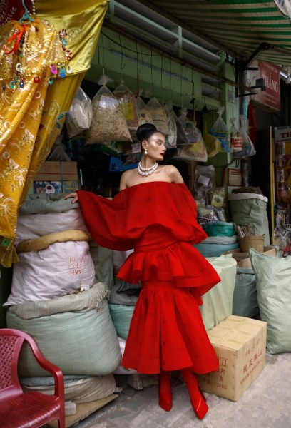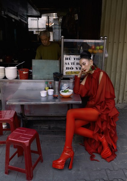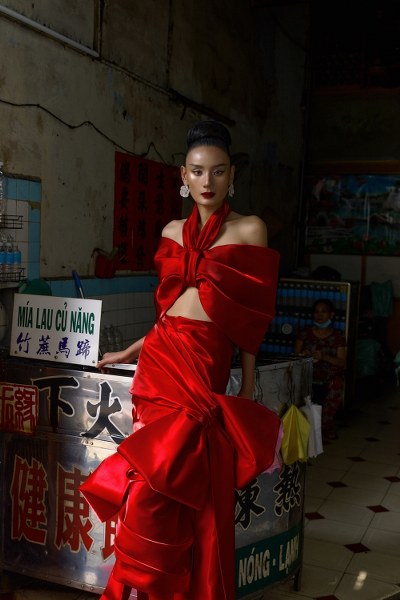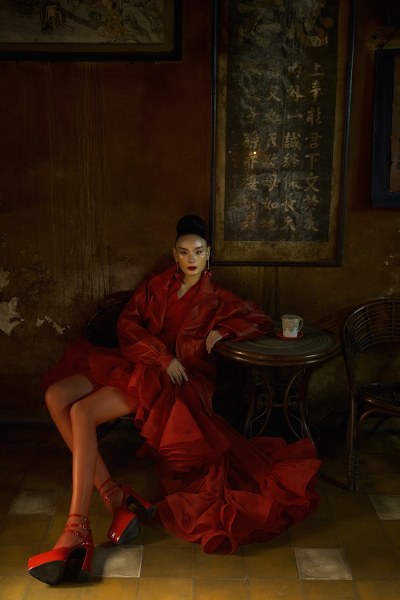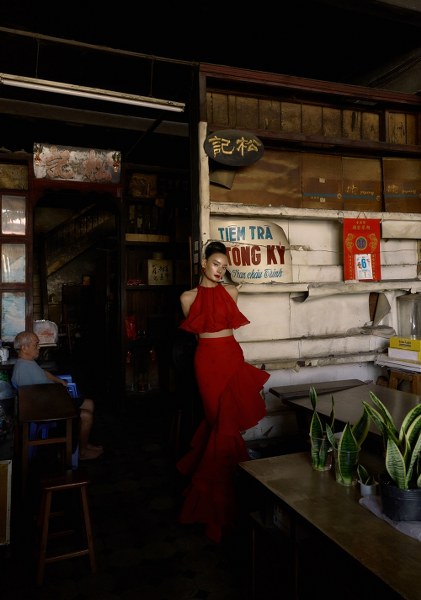 Người mẫu Lê Thúy đem đến không khí Tết với trang phục đỏ của Đỗ Mạnh Cường, tạo dáng ở quán ăn vỉa hè, tiệm trà, đường phố.