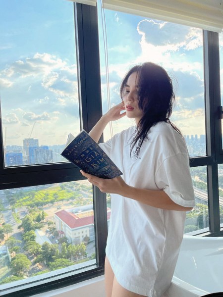 Căn hộ thoáng đãng với cửa kính lớn nhìn ra ban công, tận dụng ánh sáng tự nhiên. Kỳ Duyên chia sẻ: "Mỗi ngày đều tắt điều hòa, mở rộng cửa ban công, hít thở không khí trong lành, thấy yên tĩnh và thoải mái cực kỳ".