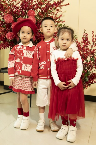 Nhà thiết kế Đỗ Mạnh Cường cùng 10 người con diện sắc đỏ với ý nghĩa may mắn dịp Tết.