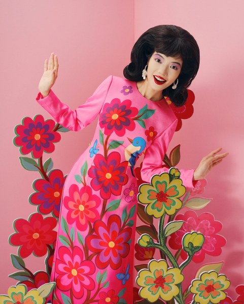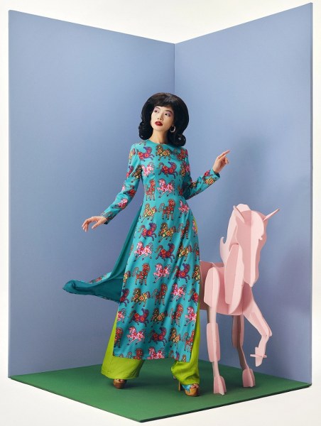 Nhà thiết kế Thủy Nguyễn ra mắt bộ sưu tập áo dài du xuân với phong cách đánh lừa thị giác, họa tiết ngựa và hoa.