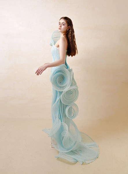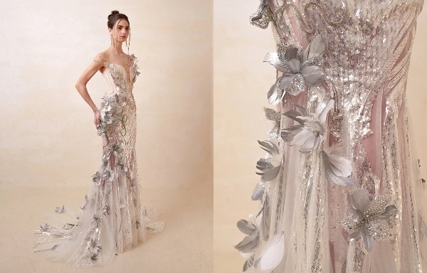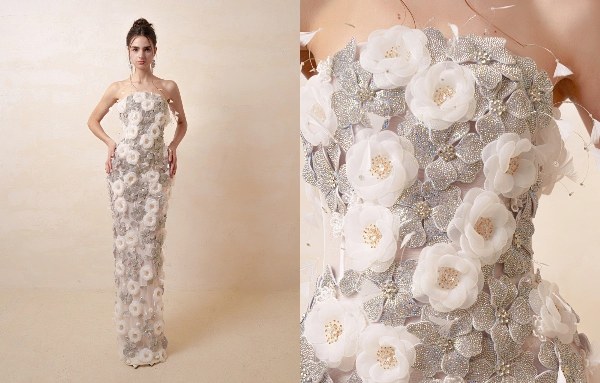 Phong cách cao cấp được thể hiện qua kỹ thuật đính kết, xếp lớp, tạo hình 3D, gắn đá, thêu nổi, nhuộm vải, gấp vải origami hoàn toàn thủ công.