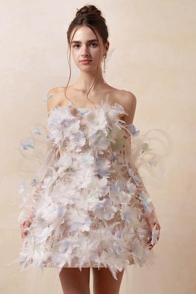 Một thiết kế xuyên thấu bằng tulle với thân trên dựng phom corset, nhấn bằng hoa vải 3D.