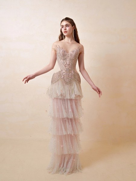 Đầm cưới xếp tầng, đính đá dáng flapper dành cho những cô dâu chuộng phong cách thập niên 1920.