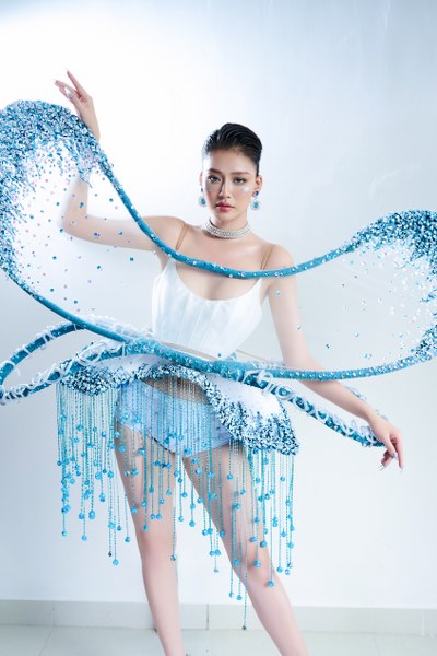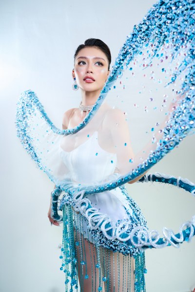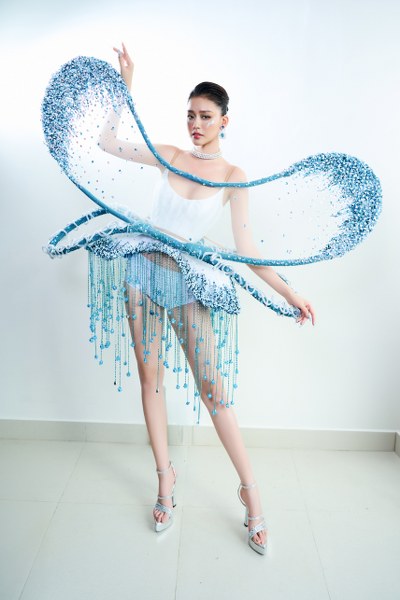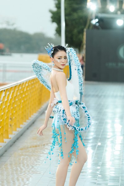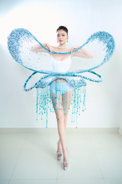 Điểm nhấn của trang phục chính là chiếc cánh đính đá màu xanh nước biển. Chiếc cánh được đeo phía trước khiến nàng hậu trông ấn tượng và nổi bật hơn.