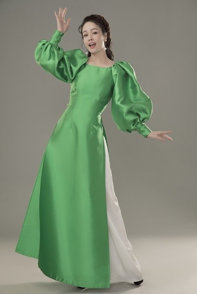 Cô diện những bộ áo dài cổ thuyền, tay bồng và vải trơn bóng, kết hợp mấn tinh xảo