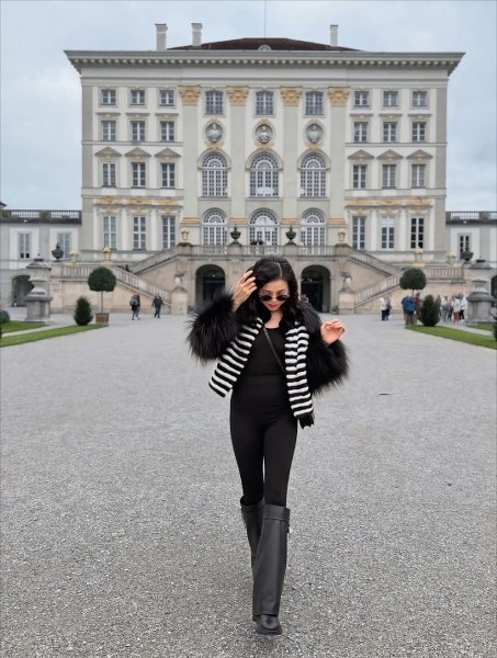Trong chuyến đi chơi châu Âu, Lệ Quyên chọn hai mẫu quần đen và trắng để tiện phối bốt cao cổ và áo khoác lông thú, thể hiện vẻ sang trọng.