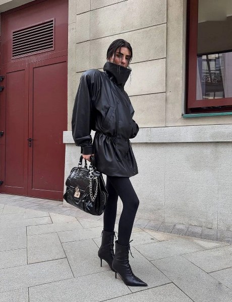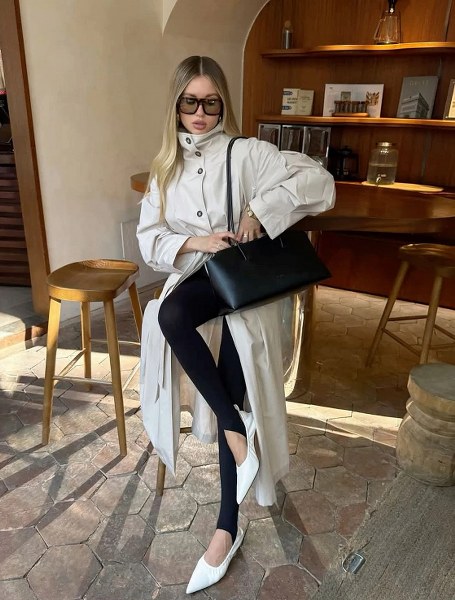 Ngoài blazer, áo khoác da, áo cape, bạn có thể mặc quần legging với áo trench coat để tạo vẻ thanh lịch.