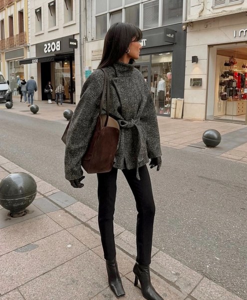Một fashionista phối chúng với bốt và áo khoác ngắn, tạo thành trang phục công sở gọn gàng và bắt mắt.