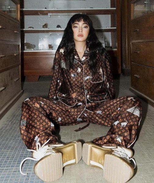 Châu Bùi thể hiện phong cách năng động và sành điệu khi dùng đôi sneakers Archlight nổi tiếng của Louis Vuitton, hơn 770 USD (18 triệu đồng), phối pyjama.