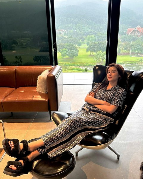 Huyền My nằm trong số sao Việt chuộng pyjama họa tiết. Hôm 12/4, á hậu đăng bức ảnh ngồi thư giãn trên ghế với bộ cánh của Dior mang họa tiết Oblique kinh điển, giá 5.871 USD (gần 138 triệu đồng). Trang phục nằm trong nhóm các thiết kế pyjama bị làm nhái nhiều nhất trên thị trường, được bán tại các cửa hàng ở Việt Nam với giá vài trăm nghìn đồng.