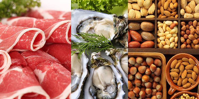 Một số nguồn thực phẩm tối ưu bao gồm: hàu sống, 6 con to vừa = 76,7mg kẽm; cua bể nấu chín, 84g = 6,5mg kẽm; thịt bò thăn, nạc, nướng, 112g = 6,33mg kẽm; hạt bí ngô sống, 1/4 cốc = 2,57mg kẽm; tôm, hấp/luộc, 112g = 1,77mg kẽm; nấm Crimini (loại nấm cúp màu nâu), chưa qua chế biến, 140g = 1,56mg kẽm; rau bina, luộc, 1 chén = 1,37mg kẽm.