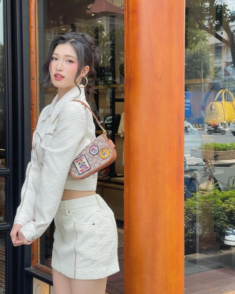 Phương Nhi tôn chân với bộ suit ngắn, nhấn bằng túi Le Sac Rond của Jacquemus khoảng 16 triệu đồng.