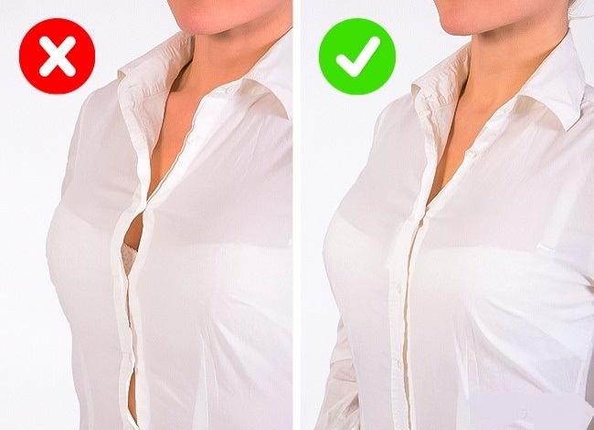 Một trong những rắc rối mà cô nàng có bộ ngực lớn thường cảm thấy khó chịu là mỗi khi mặc áo sơ mi, phần giữa hai chiếc cúc đều hở ra một lỗ nhỏ, để lộ chiếc áo lót lấp ló ở dưới. Để khắc phục, bạn hãy sử dụng băng dính hai mặt để dán chặt phần hở lại.