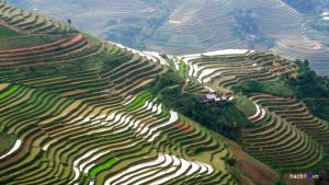 Tháng 5 là thời điểm những thửa ruộng bậc thang ở Tây Bắc thay áo chuẩn bị bước vào mùa vụ mới. Đây là mùa nước đổ hay còn gọi là đổ ải khi những cơn mưa hè đầu tiên đổ xuống, người nông dân dùng ống tre, nứa dẫn nước từ các khe núi về ruộng, tạo nên bức tranh sắc màu đa dạng. Những bậc thang vừa gieo mạ sẽ có màu xanh của lúa non, chỗ nào vừa cày cấy thì có màu nâu của đất và phù sa của nước. Ban ngày ánh mặt trời vàng rực, phản chiếu trên mặt nước lấp lánh, ban đêm, đặc biệt là vào đêm rằm, khung cảnh trở nên huyền ảo dưới ánh trăng.