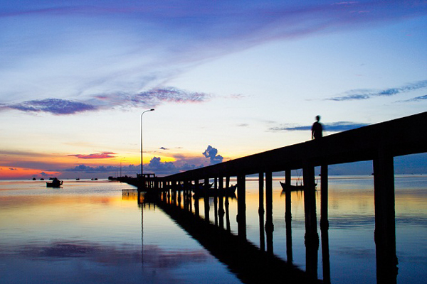 Bình minh là thời khắc tuyệt vời nhất khi nắng vàng bắt đầu chiếu sáng bãi biển và ngọn núi phủ rêu xanh. Biển ở đây dốc thoai thoải, sóng nước có khi tràn vào tận mé rừng rồi rút đi, phơi ra một bãi cát mênh mông cùng nhiều vỏ sò vỏ ốc. Đứng trên cầu cảng dài, bạn còn thấy được xa xa thấp thoáng bóng dáng của đảo Hải Tặc cùng Hòn Nghệ. Ngoài ra, đã đến làng chài cổ này, bạn đừng bỏ qua món ghẹ luộc thịt rất chắc ngọt khó nơi nào sánh bằng và nhiều món hải sản khác.