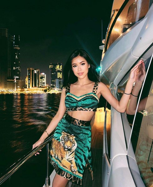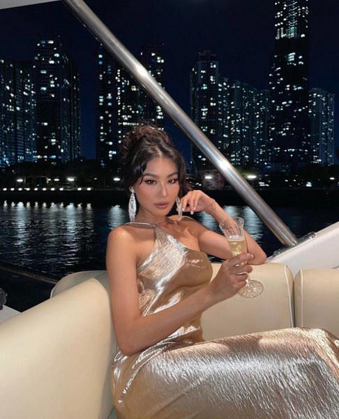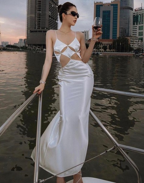 Ngọc Trinh chọn đầm lụa, bố trí nhiều đường cắt khoét khoe ngực đầy để trở thành tâm điểm của sự kiện tổ chức trên sông Sài Gòn.