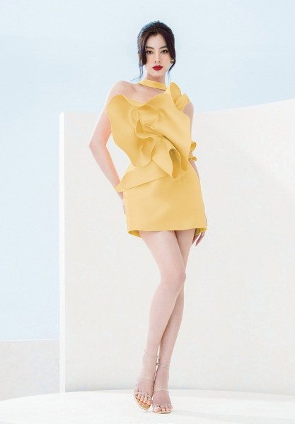 Với tạo hình một bông hoa vải ấn tượng, mẫu cocktail dress này giúp nàng trở thành "nữ hoàng" của bữa tiệc với vẻ ngoài lộng lẫy đi cùng gam màu vàng tươi tỏa sáng.