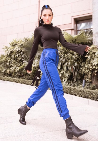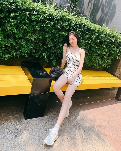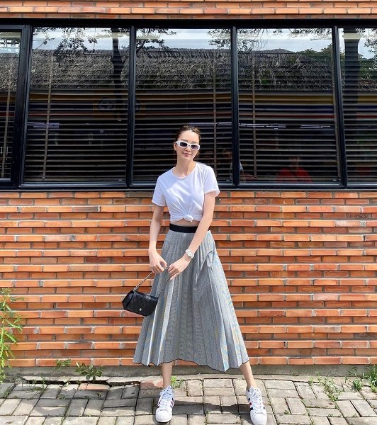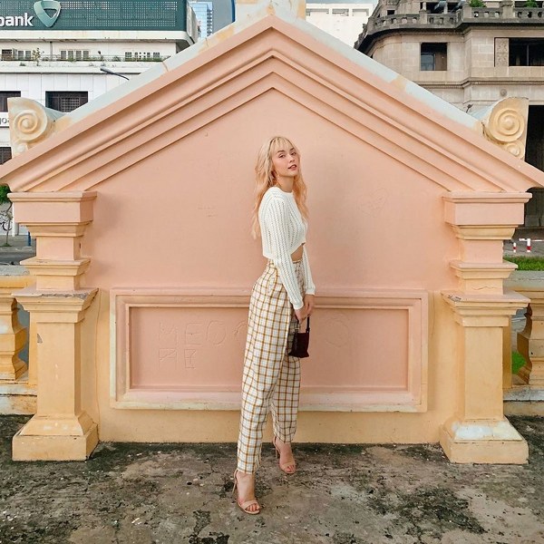 Crop top và quần kẻ cạp cao, thêm đôi sandals cùng tông màu pastel là đủ bộ để Mlee khoe dáng, làm tăng sức hút và vẻ gợi cảm.