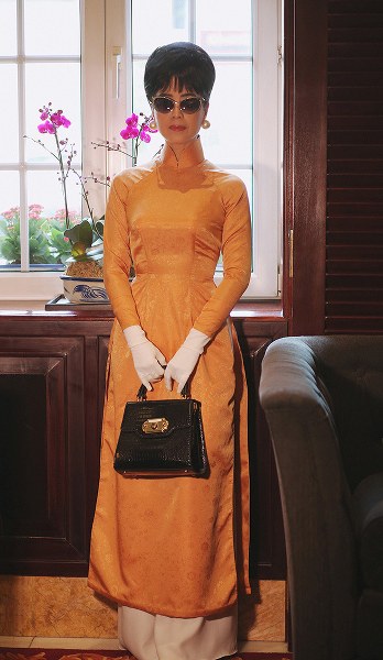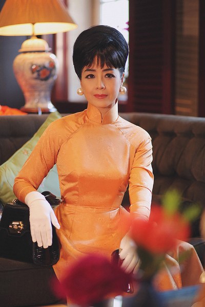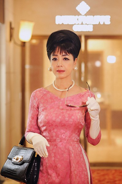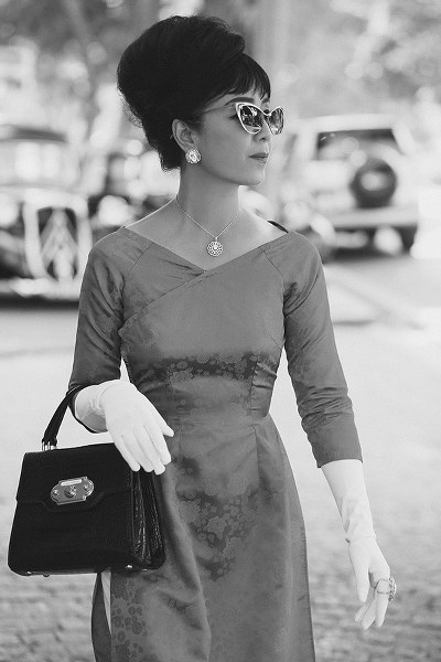 NSƯT Chiều Xuân trang điểm đậm, búi tóc, đeo trang sức và kính mát giống kiểu của bà Trần Lệ Xuân khi diện áo dài cách tân do NTK Kenny Thái thực hiện.