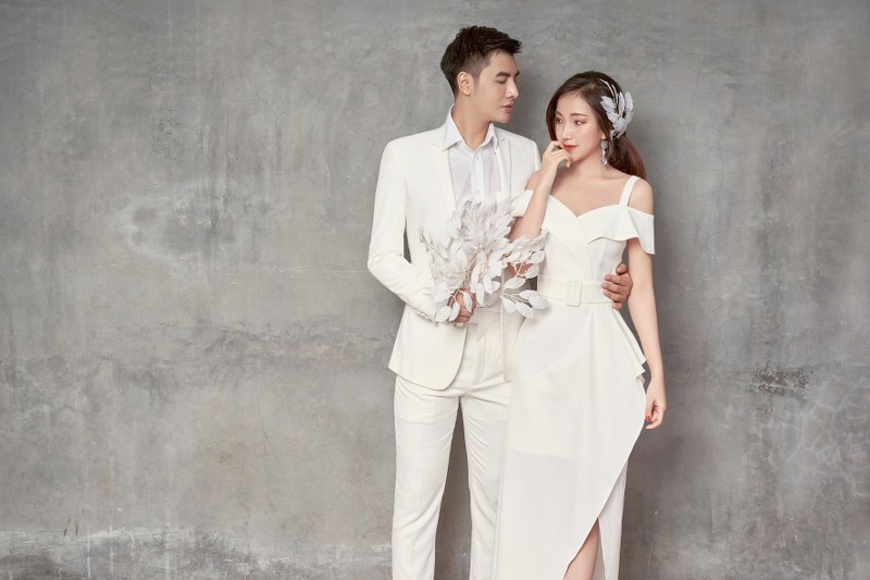 Những trang phục ứng dụng nhẹ nhàng tone màu thanh lịch ai cũng có. Nàng chọn chiếc váy trắng tiệc nhẹ, chàng mặc bộ vest đơn giản và một nhành hoa khô cũng đủ xinh lộng lẫy rồi.