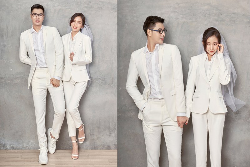 Cô gái bây giờ ai cũng có những bộ Vest, hãy chọn ngay một bộ Tone sur Tone với chàng đi kèm với voan cài đầu, hoa nhỏ hoặc vương niệm xinh xinh là thành cô dâu ngay lập tức.
