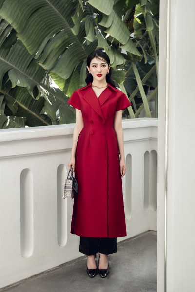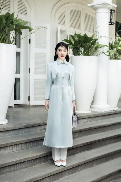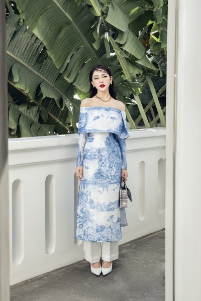 Khâu xử lý họa tiết này khá khó khăn, thách thức độ tỉ mỉ của nhà thiết kế. Tuy nhiên khi lên mẫu, những hình vẽ màu xanh trắng ẩn hiện làm toát lên dấu ấn đặc trưng của Hà Thanh Việt.