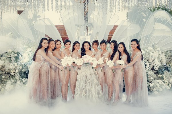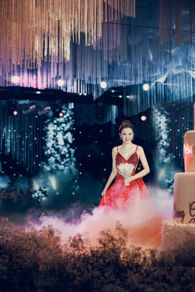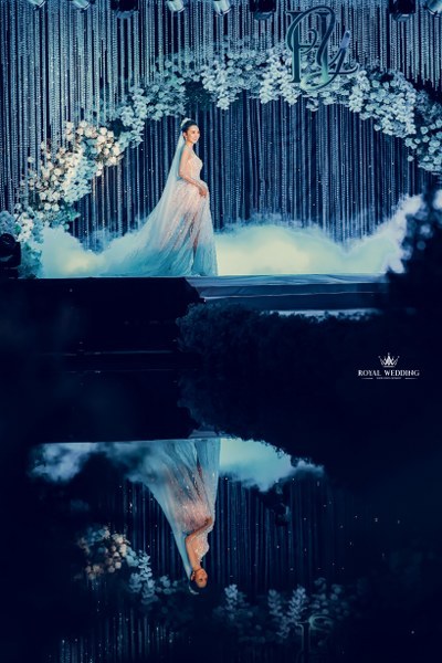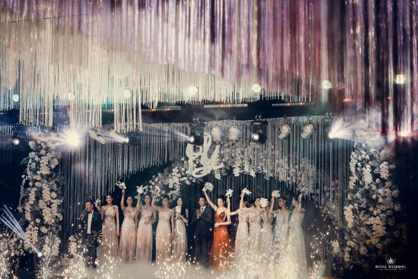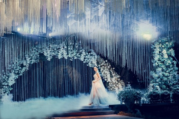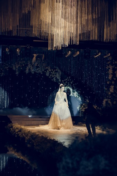 Không những thế, chiếc váy lông vũ mà cô dâu mặc đón khách còn là sự phối hợp ăn ý giữa hạt cườm kết tay, lông vũ và đá ngũ sắc cao cấp. Chính nhà thiết kế đã lên ý tưởng cho toàn bộ bữa tiệc và tính toán phối hợp tất cả phần đèn để có thể tạo nên hiệu ứng tốt nhất cho một phần lễ lung linh, gây choáng ngợp này.