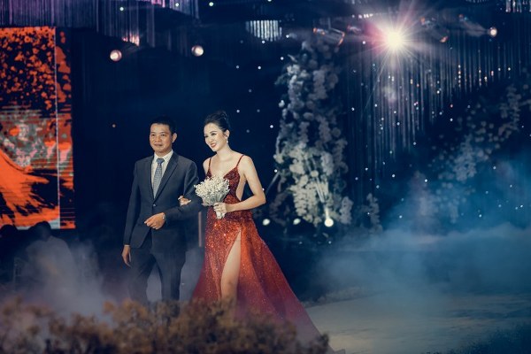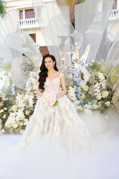 Vì vậy, các khách mời mới được chứng kiến cô dâu trong chiếc váy với phôm dáng xoè, bồng bềnh nhưng trông vẫn nhẹ nhàng, tôn lên nét đẹp thanh thoát của cô dâu.