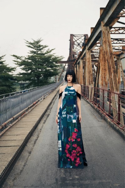 Người mẫu Ánh Ngọc khoe vẻ thanh thoát, gợi cảm khi diện trang phục cổ yếm, trễ vai thuộc sưu tập ‘Gió mùa về’ của Thủy Nguyễn, tạo dáng trên cầu Long Biên.