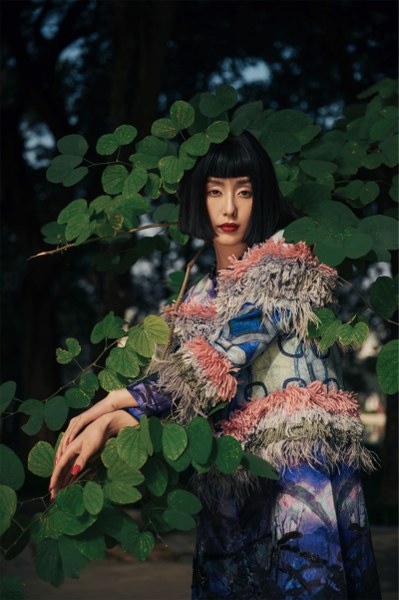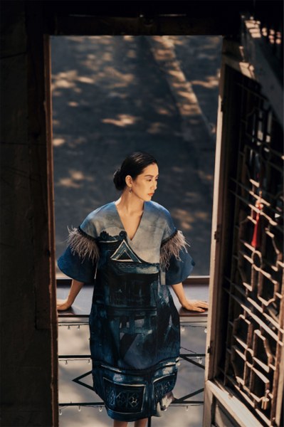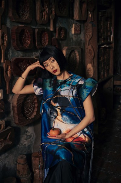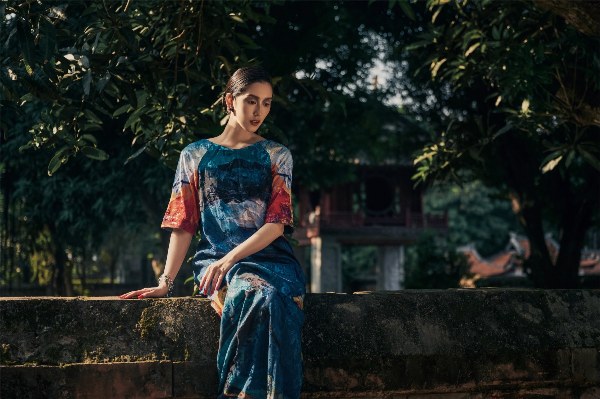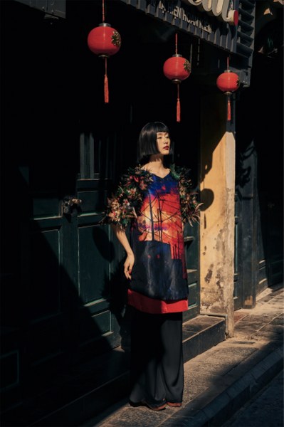 Bộ váy suông tay loe in họa tiết những đóa hoa rực rỡ bung nở trong mùa đông lấy cảm hứng từ ký ức ngày nhỏ của Thủy Nguyễn. ‘Ngày xưa, mỗi độ gió Đông Bắc tràn về, thời tiết Hà Nội lạnh cắt da cắt thịt. Lạ thay dù có gió, mưa, sương buốt đọng trên từng cành cây khô nhưng cây hồng trước nhà tôi vẫn nở hoa đỏ thắm, tỏa hương thơm ngát’, nhà thiết kế kể.