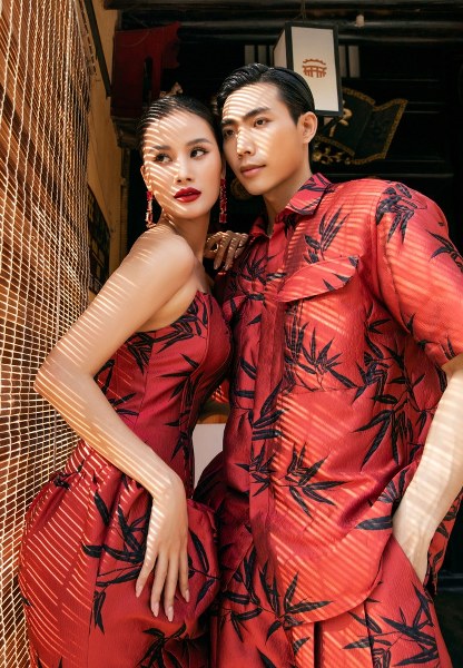 Họa tiết lá tre còn được Vũ Ngọc và Son sản xuất riêng độc đáo với hoa văn được thêu trực tiếp lên cấu trúc vải trong quá trình dệt để tạo nên chất liệu gấm jacquard cho trang phục.
