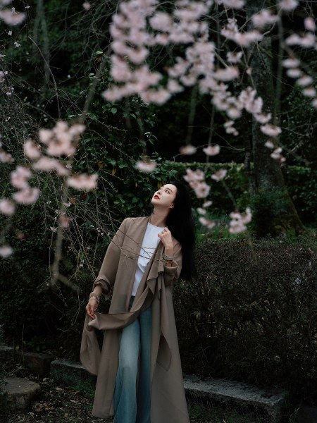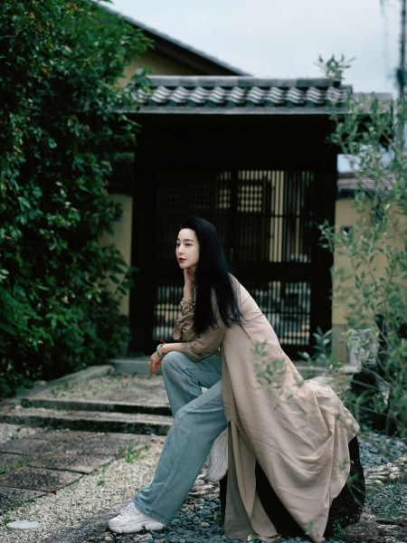 Khi du lịch Nhật Bản tháng 3, người đẹp kết hợp áo thun, quần jeans và áo choàng free size.