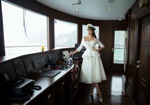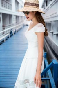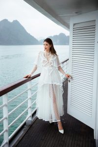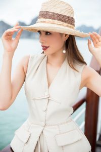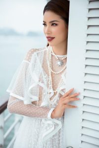 Trong bộ ảnh thời trang mới nhất của mỹ nhân họ Phạm thực hiện tại Vịnh Hạ Long, cô xuất sắc hóa thân thành nàng thủy thủy xinh đẹp, sang chảnh với loạt váy áo của Lê Thanh Hòa.