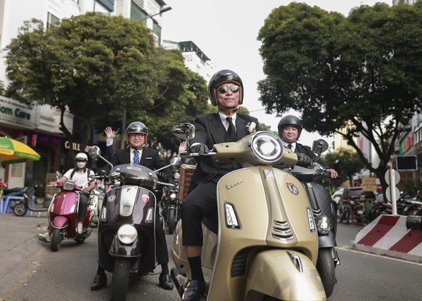 Trước khi tiệc cưới được tổ chức, Phan Hiển đã có màn rước dâu rộn ràng với dàn xe tay ga sành điệu; Khánh Thi diện đầm ngắn trẻ trung ôm eo chú rể, cười như hoa nở.