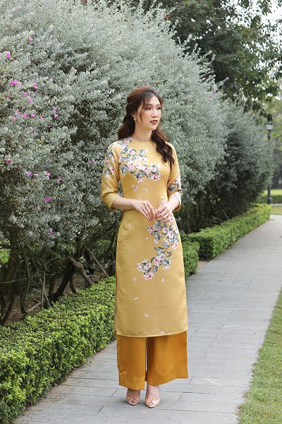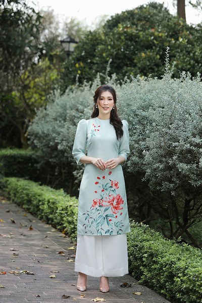 Phí Thùy Linh thường chọn quần màu trắng hoặc ton sur ton với áo dài để tạo nên tổng thể hòa hợp.